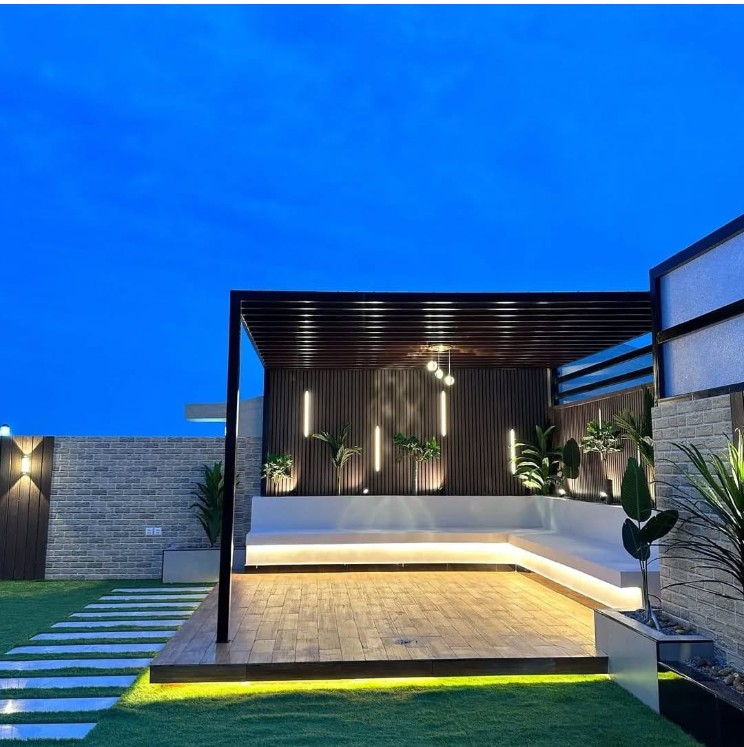 مظلات الحدائق والغرف الزجاجية والجلسات تضيف لمسة جمالية وعملية . المظلات تحمي من الشمس والمطر وتُضفي ظلًا ، بينما توفر الغرف الزجاجية مساحة مغلقة بإطلالة طبيعية .والجلسات الخارجية فتُهيئ مكاناً مثالياً للاسترخاء أو استقبال الضيوف .